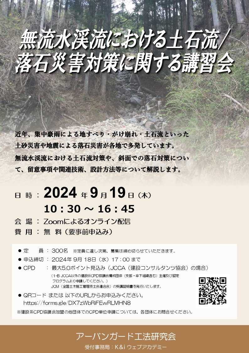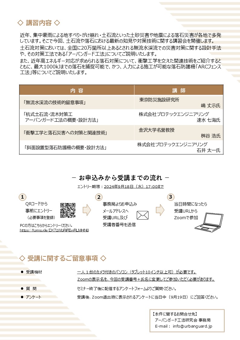 そこでこの度、アーバンガード工法研究会による「無流水渓流における土石流/落石災害対策に関する講習会」を、オンラインにて開催いたします。